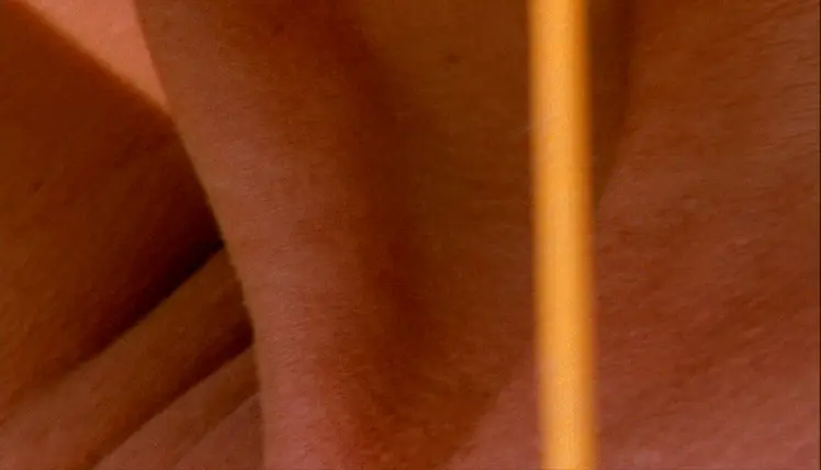Es ist eine Videoausschnitt einer Nahansicht eines Halses zu sehen, erleuchtet in orangenem warmen Licht.
