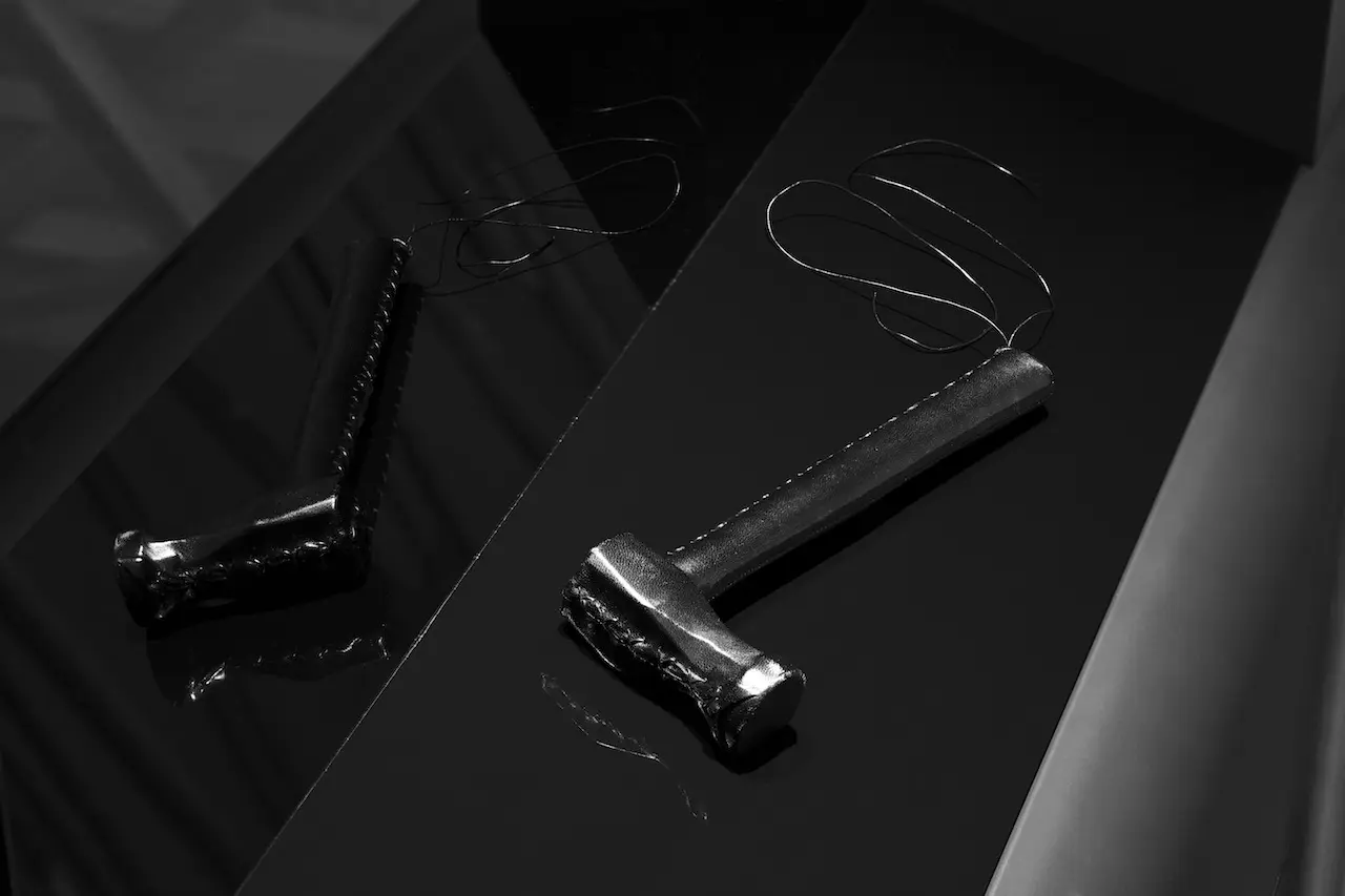 Dieser Hammer hat nichts mit dem profanen Gebrauchsgegenstand zu tun, den wir auf den ersten Blick in ihm zu erkennen meinen. Im Gegenteil: er ist ganz und gar unbrauchbar. Mit dem aufwendig in feinstes Handschuhleder verschnürten „Leather Hammer # 1“ inszeniert die italienische Künstlerin Monica Bonvicini (geb. 1965) ein überaus ästhetisches und sinnliches Schmuckstück, dessen Materialität und Präsentation an Extravaganz, statt an grobe Arbeit denken lassen.