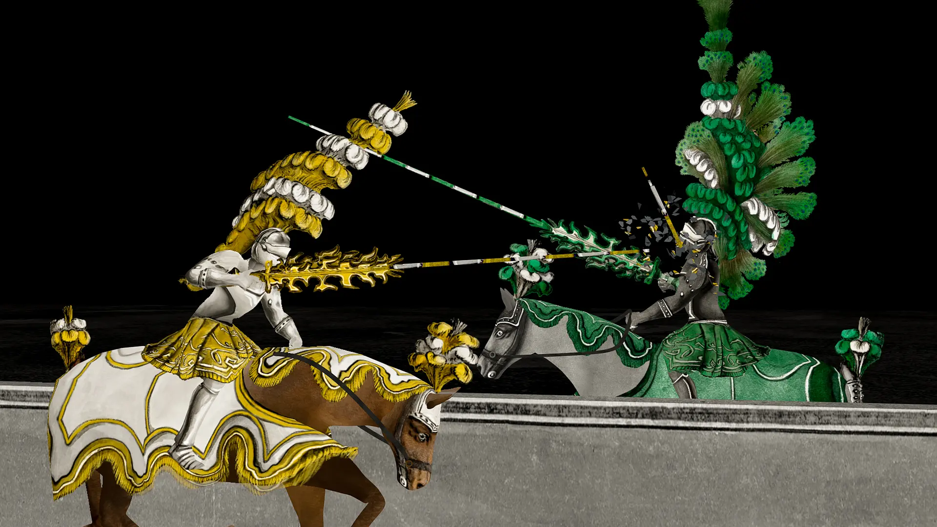 Die Inszenierung beginnt mit der Turnier-Ankündigung des Herolds nacheinander in verschiedenen Ecken des Raumes. Dann erfüllt die Atmosphäre eines lebendigen Turnierspektakels den Raum: Aus den Lautsprechern hören die Museumsbesucher, wie aufgeregte Turniergäste die Ereignisse ihrer Epochen beschreiben, und sich über die Harnische unterhalten, die im Bild und in der jeweiligen Vitrine aufleuchten. Die Spannung steigt, das Turnier beginnt und nacheinander werden die Kämpfe eines Ritterturniers nacherlebbar. Der Klang schwerer Schwerter durchdringt den Riesensaal. Höhepunkt sind die Erlebnisse der sächsischen Kurfürsten, die selbst an Turnieren teilgenommen haben – schon Kurfürst August hatte in 55 Turnieren seinen Mut und sein Geschick unter Beweis gestellt.